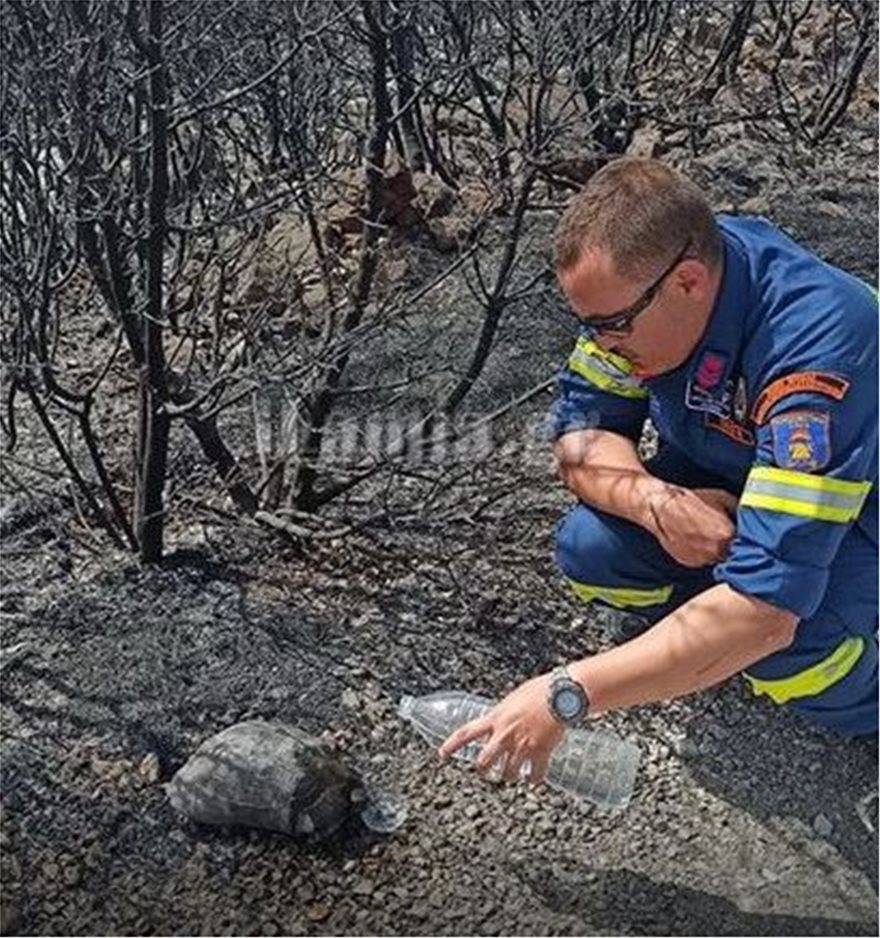 Ο πυροσβέστης της 7Ης ΕΜΑΚ που βρίσκεται στο σημείο κάνοντας την υπηρεσία του την βλέπει… Της δίνει νερό με το μπουκάλι του, της δίνει ζωή…