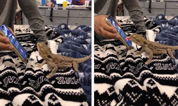«Απλά της αρέσει να τρώει οτιδήποτε που μοιάζει παρόμοιο με το φαγητό της» λέει η Βάλερι για τη σαύρα της, που στοχεύει το κόκκινο κουμπί του τηλεφώνου, λες και πρόκειται για κάποια λαχταριστή μυγούλα ή κάποιο σκουλικάκι.