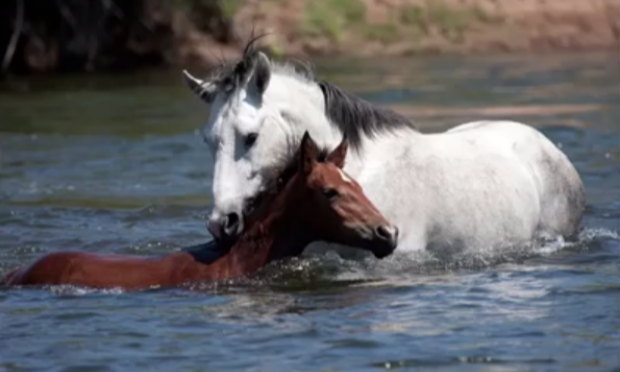 Τι ακριβώς κάνει; Σώζει ένα νεογέννητο πουλάρι από τον ορμητικό ποταμό λες και είναι κομάντο.