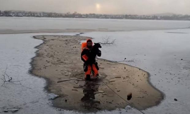 Ένας σκύλος που κατέληξε στο δρόμο, όταν ο ιδιοκτήτης του πέθανε, βρέθηκε παγιδευμένος στα παγωμένα νερά μιας λίμνης στην ρωσική πόλη Νίζνι Ταγκίλ, ενώ κυνηγούσε πουλιά.
