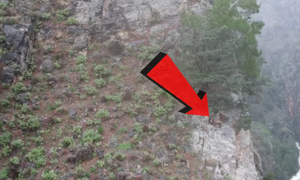 Το αγρίμι φαίνεται να αιφνιδιάζεται από την απρόσμενη και… ιπτάμενη επίσκεψη και αρχίζει να σκαρφαλώνει με μεγάλη επιδεξιότητα τα βράχια για να βρει εν τέλει την… ησυχία του!