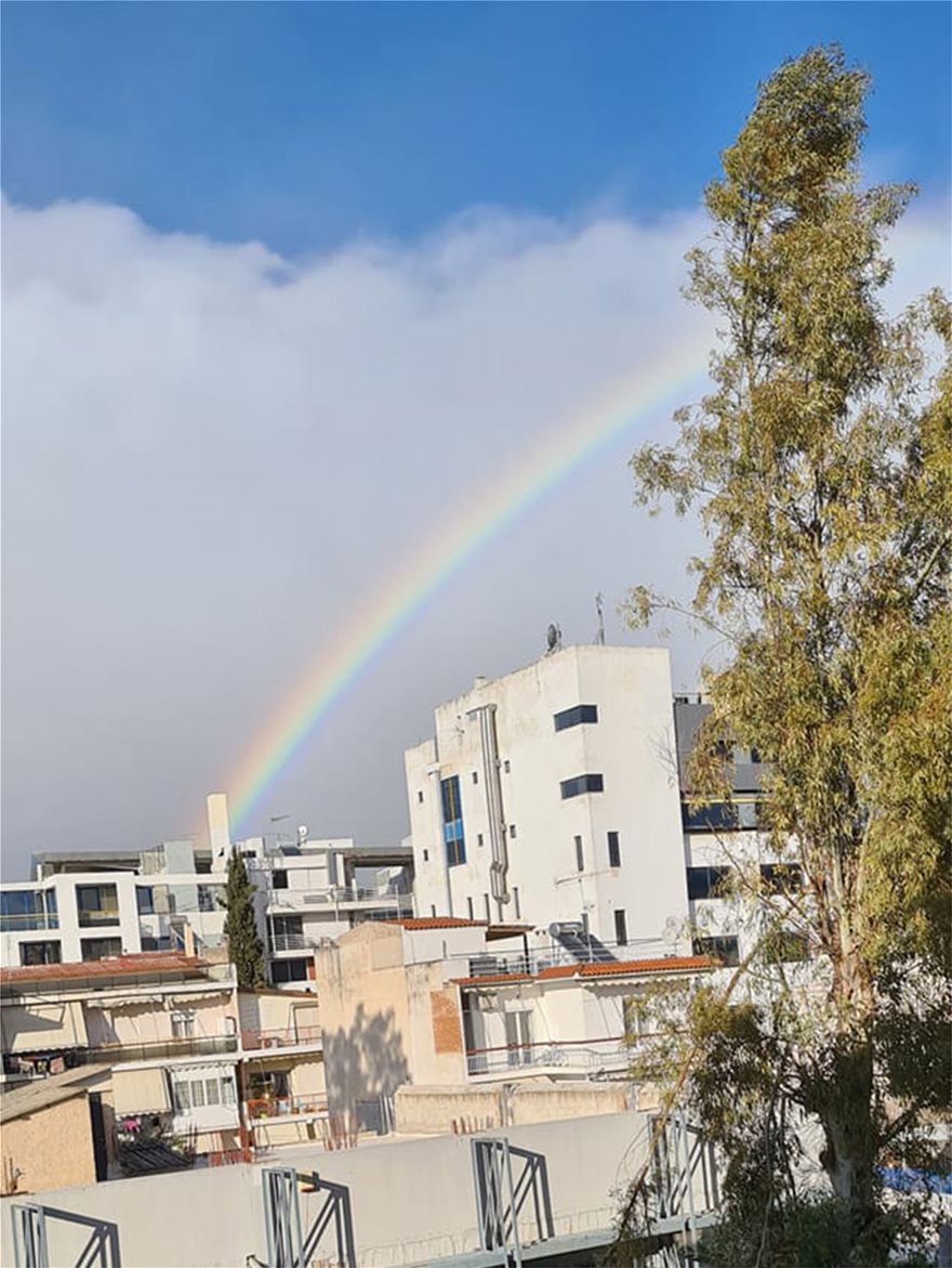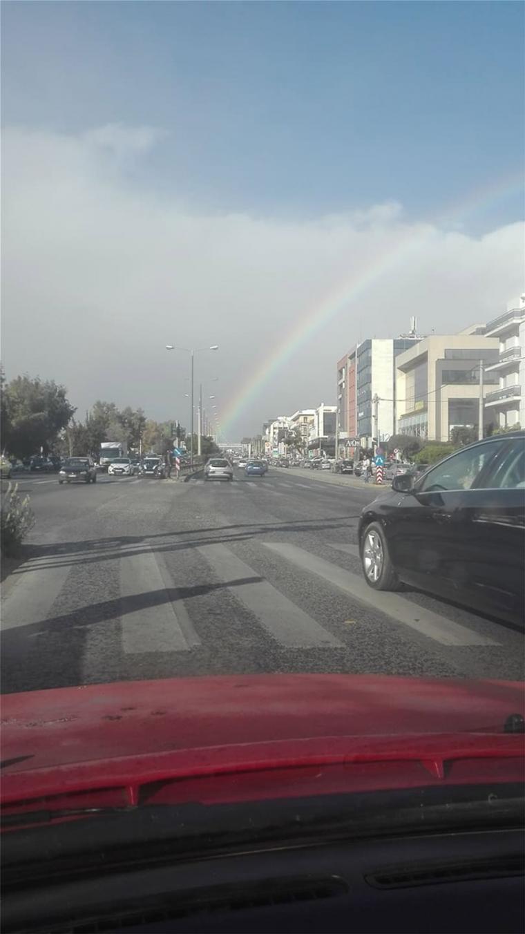 Ένα εκπληκτικό ουράνιο τόξο είχε σχηματιστεί πάνω από τον αττικό ουρανό, την ίδια στιγμή που είχε βγει ένας γεμάτος ήλιος και ταυτόχρονα έριχνε... κάτι σαν χιονόνερο, δίχως να κάνει ιδιαίτερο κρύο.