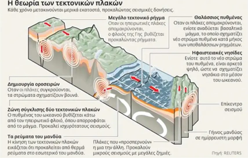 Κοινώς, οι σεισμοί στην Κρήτη οφείλονται στη σύγκρουση δύο αχανών κομματιών γης: Της Αφρικανικής και της Ευρασιατικής «πλάκας». Καθώς κινούνται με αντίθετη φορά η μία προς την άλλην, η Αφρικανική πλάκα βυθίζεται κάτω από την Ευρασιατική, σε μια διεργασία που εξελίσσεται ακατάπαυστα επί εκατομμύρια χρόνια.