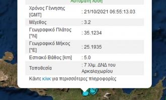Ο σεισμός παρά το μικρό του μέγεθος, ταρακούνησε τόσο το πολύπαθο Αρκαλοχώρι όσο και το Ηράκλειο της Κρήτης. Η δόνηση των 3,2 Ρίχτερ είχε εστιακό βάθος μόλις 5 χιλιομέτρων και επίκεντρο 7 χιλιόμετρα νοτιοδυτικά του Αρκαλοχωρίου.