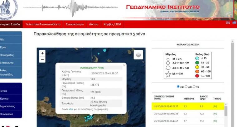 Νέα ασθενής σεισμική δόνηση 3,3 Ρίχτερ σημειώθηκε στις 08:41 το πρωί της Τρίτης 26 Οκτωβρίου, μόλις πέντε χιλιόμετρα βορειοανατολικά του Αρκαλοχωρίου στην Κρήτη με εστιακό βάθος 9,3 χιλιομέτρων.