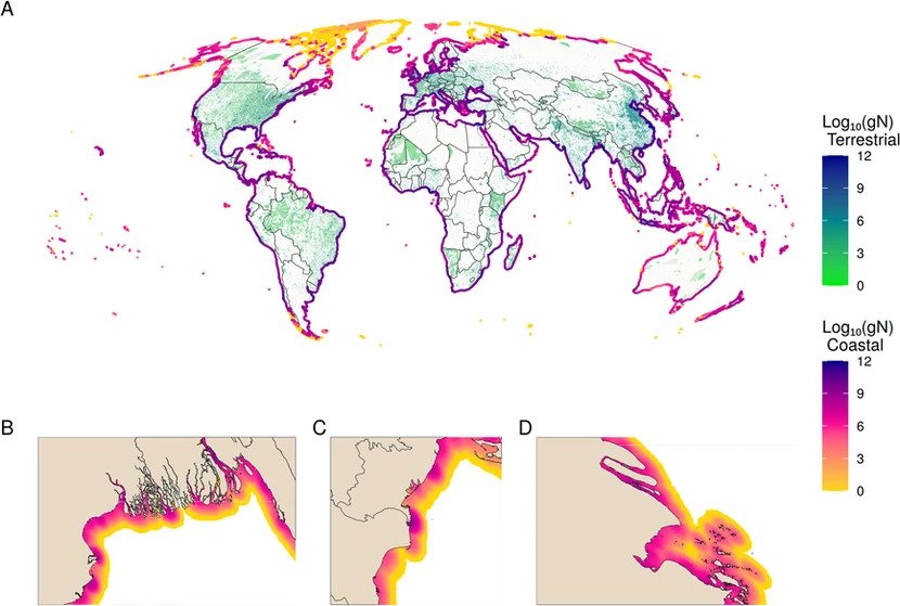 Α) Παγκόσμιος χάρτης των χερσαίων πηγών (πράσινο έως μπλε) και παράκτια διάχυση εισροών (κίτρινο έως μωβ) των συνολικών λυμάτων Ν, μετρημένο σε log10(gN) και στα δύο. Τα παράκτια φτερά έχουν προστεθεί σε τμήματα γραμμών για να υπερβάλουν τα μοτίβα ώστε να είναι ορατά σε παγκόσμια κλίμακα. Τα ένθετα δείχνουν μεγεθυμένες όψεις των ποταμών Β) Γάγγη, Γ) Δούναβη και Δ) Τσανγκ Τζιανγκ (Γιανγκτζέ), που δείχνουν συγκέντρωση λυμάτων σε υψηλή ανάλυση.