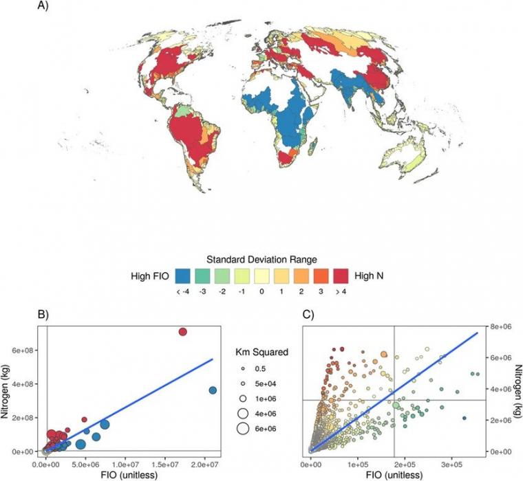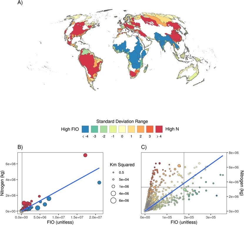 Λεκάνες απορροής για τις οποίες το συνολικό Ν υπερβαίνει (κίτρινα έως κόκκινα χρώματα) ή είναι πολύ χαμηλότερα (πράσινα έως μπλε χρώματα) τα αναμενόμενα επίπεδα δεδομένων των προβλεπόμενων εκροών αζώτου/παθογόνου από τη συσχέτισή τους. Παγκόσμιος χάρτης (Α) και διασπορά όλων των λεκανών απορροής, τόσο σε πλήρη έκταση (Β) όσο και με μεγέθυνση (C). Οι λεκάνες απορροής για τις οποίες τα επίπεδα είναι ανάλογα με τις προσδοκίες είναι λευκές στον χάρτη, συμπεριλαμβανομένου του σχεδόν 50% των (πολύ μικρών) λεκανών απορροής για τις οποίες δεν υπάρχουν εισροές αζώτου ή παθογόνων. Οι κουκκίδες στο διάγραμμα διασποράς κλιμακώνονται στο μέγεθος της λεκάνης απορροής.