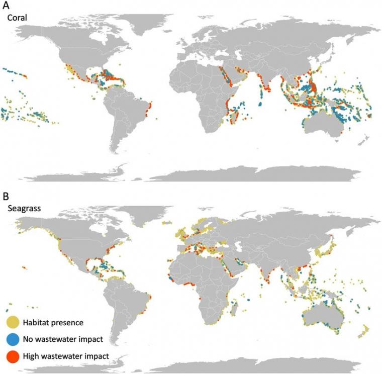 Οι χάρτες δείχνουν πού Α) οι κοραλλιογενείς ύφαλοι και Β) οι κοίτες του θαλάσσιου χόρτου επηρεάζονται έντονα (κυψέλες ράστερ στο πάνω μέρος του 2,5% της έκθεσης, κόκκινες κουκκίδες), δεν επηρεάζονται (χωρίς έκθεση σε λύματα N, σκούρες μπλε κουκκίδες) ή επηρεάζονται αλλά όχι στην κορυφή 2,5% (κίτρινες κουκκίδες).