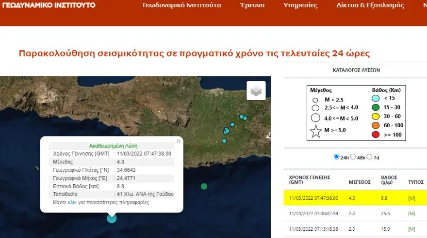 Σεισμική δόνηση 4 βαθμών της κλίμακας Ρίχτερ, σύμφωνα με το Γεωδυναμικό Ινστιτούτο Αθηνών, σημειώθηκε πριν λίγη ώρα, στον θαλάσσιο χώρο έξω από την Κρήτη.
