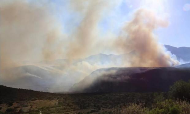 Σύμφωνα με την Πυροσβεστική οι πρώτες πληροφορίες δείχνουν ότι η φωτιά ξεκίνησε από κεραυνό σε δασική έκταση και δεν απειλείται κάποιος οικισμός.