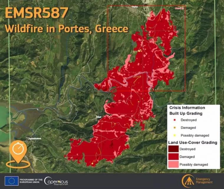 Η πυρκαγιά είναι πολύ μεγάλη και η ανακοίνωση της υπηρεσίας Copernicus αποτυπώνει το μέγεθος της καταστροφής που υπέστη η περιοχή.