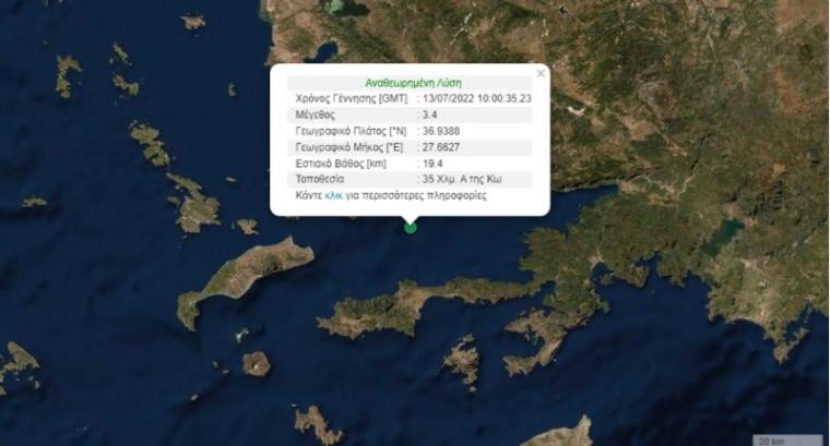 Ο σεισμός στην Κω έχει μέγεθος 3,4 βαθμούς της κλίμακας Ρίχτερ, όπως ανακοίνωσε το Γεωδυναμικό Ινστιτούτο. Το επίκεντρο εντοπίζεται σε απόσταση 35 χιλιομέτρων ανατολικά του νησιού στον θαλάσσιο χώρο.
