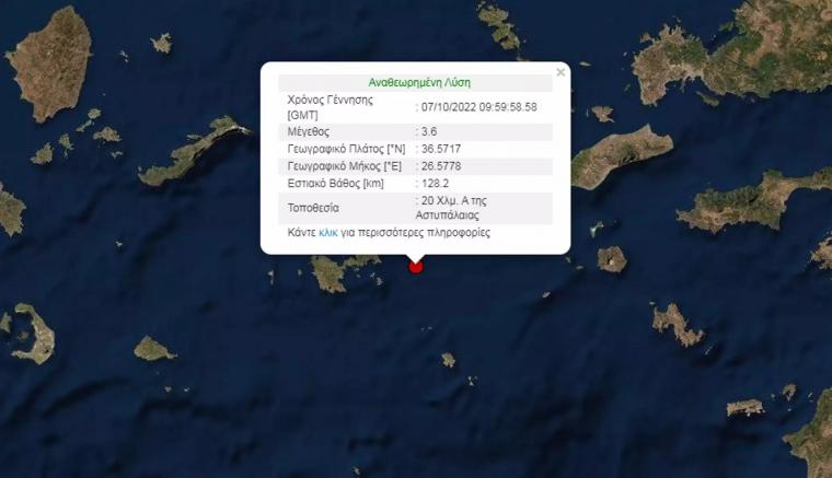 Ο σεισμός των 3,6 R στην Αστυπάλαια στη 1 το μεσημέρι έχει επίκεντρο τη θαλάσσια περιοχή που απέχει 20 χιλιόμετρα ανατολικά του νησιού. Το εστιακό βάθος εντοπίζεται στα 128,2 χιλιόμετρα, σύμφωνα με την ανακοίνωση του Γεωδυναμικού Ινστιτούτου του Εθνικού Αστεροσκοπείου Αθηνών.
