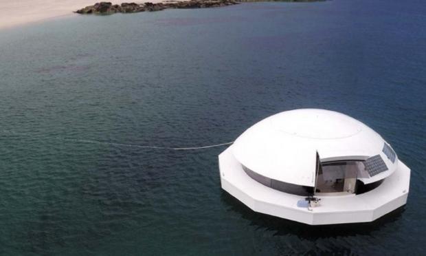 Μια λευκή κάψουλα πλέει στη μέση γαλαζοπράσινων νερών. Στο εσωτερικό της, μια τεράστια πολυτελής κρεβατοκάμαρα, μια μικρή κουζίνα και όλες οι ανέσεις που προσφέρει μια σουίτα ξενοδοχείου.