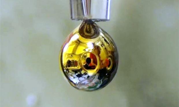 Καθώς η σταγόνα σχηματιζόταν μέσα σε έναν θάλαμο κενού, μια μικρή ποσότητα υδρατμών συμπυκνώθηκε στην επιφάνειά της και σχημάτισε ένα στρώμα νερού πάχους μερικών μορίων. Αμέσως, ηλεκτρόνια και ιόντα του μεταλλικού κράματος διαχύθηκαν στο νερό και το μετέτρεψαν σε μέταλλο με μπρονζέ απόχρωση.