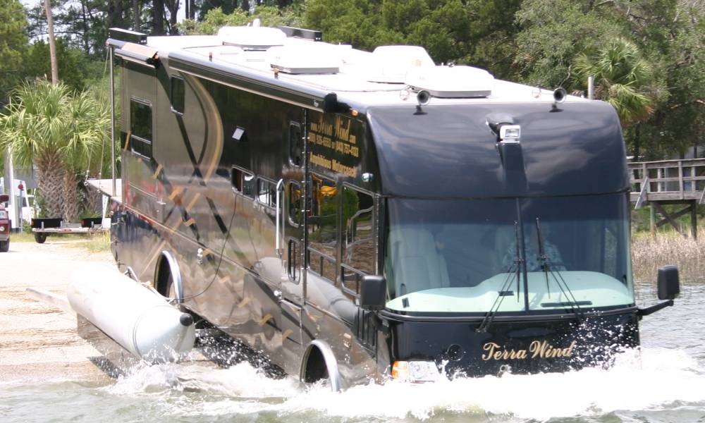 Ναι, καλά διαβάσατε, καθώς όπως αναφέρθηκε και παραπάνω το Terra Wind μπορεί να κινηθεί και στο νερό, πάντα υπό προϋποθέσεις και περιορισμούς, όπως την χρήση του στη θάλασσα, λόγω του αλατιού. Εννοείται ότι ο βασικός του εξοπλισμός περιλαμβάνει δύο προπέλες, οι οποίες παίρνουν κίνηση από τον εξακύλινδρο υπερτροφοδοτούμενο πετρελαιοκινητήρα 7,2 λίτρων της Caterpillar, που αποδίδει 335 ίππους, ο οποίος προσφέρει ταχύτητες έως και 4 κόμβους (7,4 χλμ./ώρα) στο νερό και αντίστοιχα 135 χλμ./ώρα στην άσφαλτο.