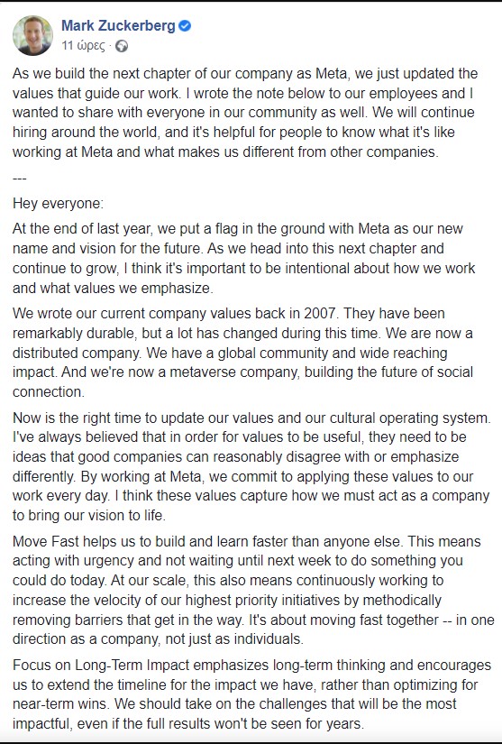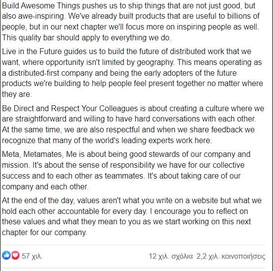 «Καθώς γράφουμε το επόμενο κεφάλαιο της εταιρείας μας ως Meta, απλώς ενημερώσαμε τις αξίες και τις πολιτικές μας. Έγραψα το παρακάτω σημείωμα στους υπαλλήλους μας και ήθελα να το μοιραστώ με όλους στην κοινότητά μας» ανέφερε χαρακτηριστικά στην ανάρτησή του.