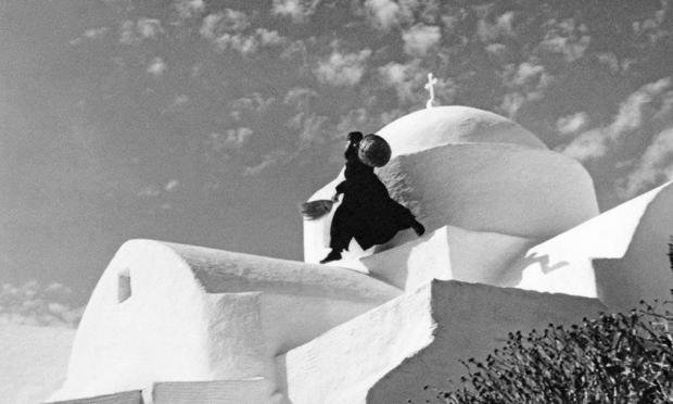 Η ΦΩΤΟ ΔΕΙΧΝΕΙ ΕΝΑ ΙΕΡΕΑ ΝΑ ΑΙΩΡΕΙΤΑΙ ΣΤΟ ΤΡΟΥΛΟ ΤΗΣ ΚΥΚΛΑΔΙΤΙΚΗΣ ΕΚΚΛΗΣΙΑΣ ΓΙΑ ΤΟ ΣΥΝΗΘΙΣΜΕΝΟ ΑΣΠΡΙΣΜΑ ΤΗΣ.