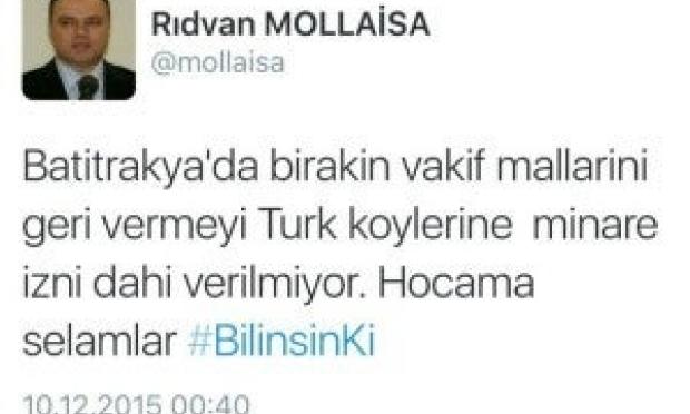 Πρόσφατα σέ “τιτίβισμά” του στό twitter (βλ. εἰκόνα παραπλεύρως) διατύπωσε τή γνώμη πώς στήν Ἑλλάδα “ὄχι μόνο ἡ βακουφική περιουσία δέν ἀποδίδεται” – σέ ποιόν ἄραγε;… – ἀλλά καί “στά τούρκικα χωριά οὔτε ἄδεια γιά μιναρέ δέν δίνεται”!