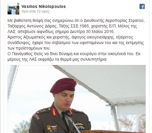 Εν τω μεταξύ διάχυτη είναι η θλίψη που έχει προκαλέσει η απώλεια του ταξίαρχου στους συναδέλφους και τους συμμαθητές του. Δείτε χαρακτηριστικά, τι λένε στα μέσα κοινωνικής δικτύωσης.