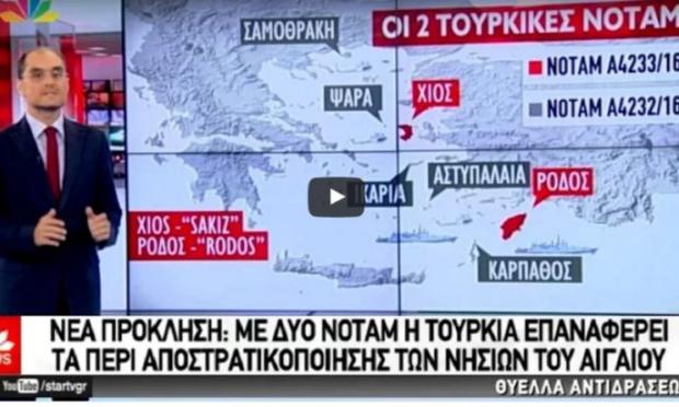 Οι προκλήσεις της Τουρκίας συνεχίστηκαν και σήμερα με δύο ΝΟΤΑΜ, σε απάντηση δυο ελληνικών αναγγελιών για ασκήσεις στο Αιγαίο 2 – 7 Οκτωβρίου από την πολεμική αεροπορία. Στην πρώτη ΝΟΤΑΜ οι Τούρκοι ισχυρίζονται ότι η Ελλάδα παραβιάζει την συμφωνία για την αποστρατιωτικοποίηση των νησιών Ρόδου και Χίου (νησιά που αναφέρουν με τουρκικά ονόματα). Στην δεύτερη ΝΟΤΑΜ οι τουρκικές αρχές πάλι με τους ίδιους ισχυρισμούς, ζητούν να μην κάνουμε ασκήσεις στην Σαμοθράκη, στα Ψαρά, την Χίο, την Ικαρία, την Κάρπαθο και την Αστυπάλαια.