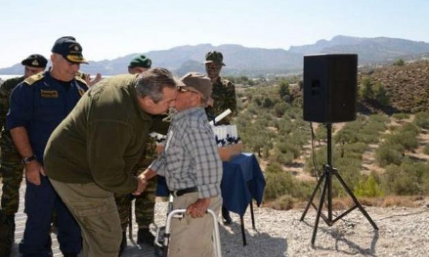 Ο γηραιότερος Εθνοφύλακας και καταδρομέας υποδέχθηκε τον Πάνο Καμμένοστην Ρόδο κατά την διάρκεια της ασκήσεως ΠΑΡΜΕΝΙΩΝ 2017.
