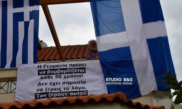 Με το δικό του τρόπο στέλνει μήνυμα στην Γερμανία ένας κάτοικος της Νέας Κίου από την Αργολίδα εν όψει της Εθνικής Επετείου της 28ης Οκτωβρίου, με δύο μεγάλες ελληνικές σημαίες και ένα πανό που κρέμασε στο μπαλκόνι του.