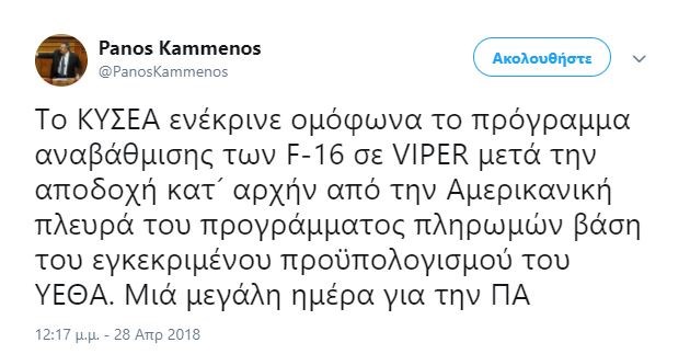 "Το ΚΥΣΕΑ ενέκρινε ομόφωνα το πρόγραμμα αναβάθμισης των F-16 σε VIPER μετά την αποδοχή κατ´ αρχήν από την Αμερικανική πλευρά του προγράμματος πληρωμών βάση του εγκεκριμένου προϋπολογισμού του ΥΕΘΑ. Μιά μεγάλη ημέρα για την ΠΑ.", έγραψε ο κ. Καμμένος στον προσωπικό του λογαριασμό στο Twitter.