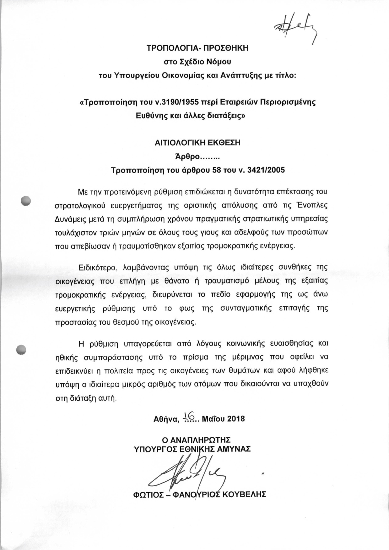 Στην αιτιολογική έκθεση αναφέρεται ότι Ειδικότερα, όπως υποστηρίζει ο αναπληρωτής υπουργός ΕθνικήςΆμυνας Φώτης Κουβέλης στην αιτιολογική έκθεση, λαμβάνοντας υπόψη τις όλως ιδιαίτερες συνθήκες της οικογένειας που επλήγη με θάνατο ή τραυματισμό μέλους της εξαιτίας τρομοκρατικής ενέργειας, διευρύνεται το πεδίο εφαρμογής της ως άνω ευεργετικής ρύθμισης υπό το φως της συνταγματικής επιταγής της προστασίας του θεσμού της οικογένειας.
