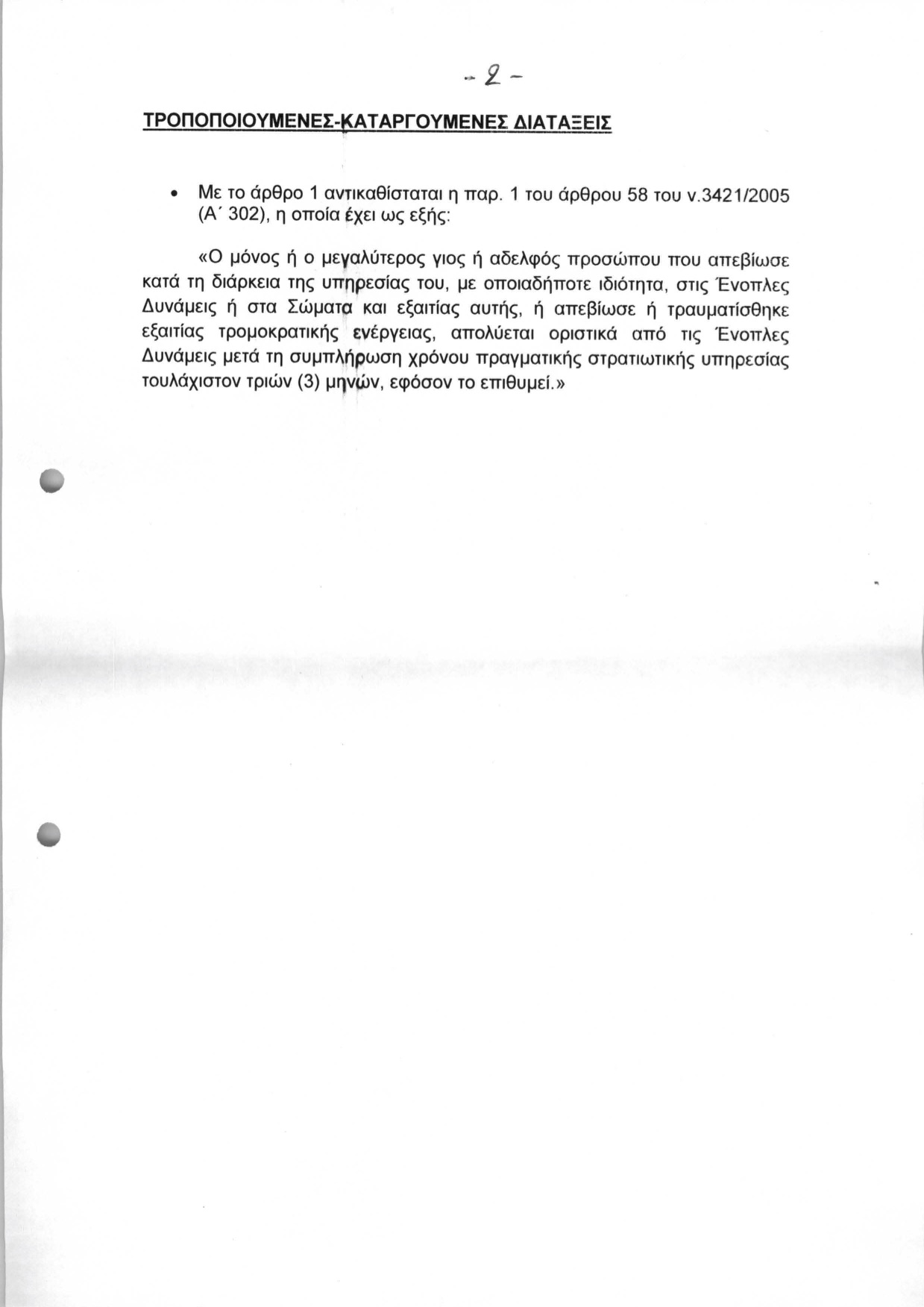 Όπως ορίζουν οι διατάξεις της τροπολογίας «Ο μόνος ή ο μεγαλύτερος γιος ή αδελφός προσώπου που απεβίωσε κατά τη διάρκεια της υπηρεσίας του, με οποιαδήποτε ιδιότητα, στις Ένοπλες Δυνάμεις ή στα Σώματα και εξαιτίας αυτής, ή απεβίωσε ή τραυματίσθηκε εξαιτίας τρομοκρατικής ενέργειας, απολύεται οριστικά από τις Ένοπλες Δυνάμεις μετά τη συμπλήρωση χρόνου πραγματικής στρατιωτικής υπηρεσίας τουλάχιστον τριών (3) μηνών, εφόσον το επιθυμεί.»