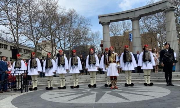Παρουσία των ευζώνων της προεδρικής φρουράς έγινε η τελετή έπαρση της ελληνικής σημαίας, στην πλατεία Αθηνών στην Αστόρια.