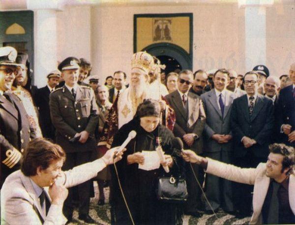 Η Κυρά της Ρω κατά την τελετή παρασημοφόρησης από το Ελληνικό Ναυτικό στο Καστελόριζο. Κάθε φορά που έβλεπε ένα καράβι να περνά έτρεχε στα βράχια και ανέβαζε τη σημαία…