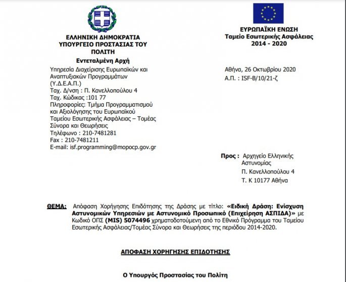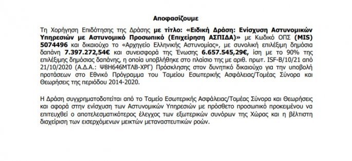 Ηεπιχείρηση της ΕΛ.ΑΣ., με την κωδική ονομασία «Ασπίδα», για τη φύλαξη των χερσαίων ελληνοτουρκικών συνόρων στον Έβρο, ενισχύεται με χρήματα της Ευρωπαϊκής Ένωσης. Απόφαση με ημερομηνία 26 Οκτωβρίου 2020 προβλέπει χρηματοδότηση ύψους 7,4 εκατομμυρίων ευρώ. Δικαιούχος της επιδότησης είναι το αρχηγείο της ΕΛ.ΑΣ. Από τα 7,4 εκατομμύρια ευρώ, τα 6,7 εκατομμύρια ευρώ (δηλαδή το 90% του ποσού) χορηγούνται από την Ε.Ε. και συγκεκριμένα από το Ταμείο Εσωτερικής Ασφάλειας.
