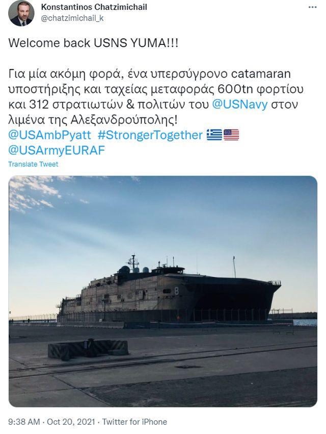 «Καλωσόρισες USNS Yuma», έγραψε σε ανάρτησή του ο πρόεδρος του Οργανισμού Λιμένος Αλεξανδρούπολης Κωνσταντίνος Χατζημιχαήλ.