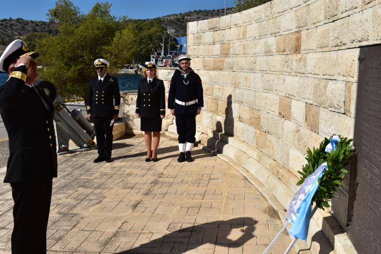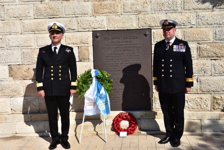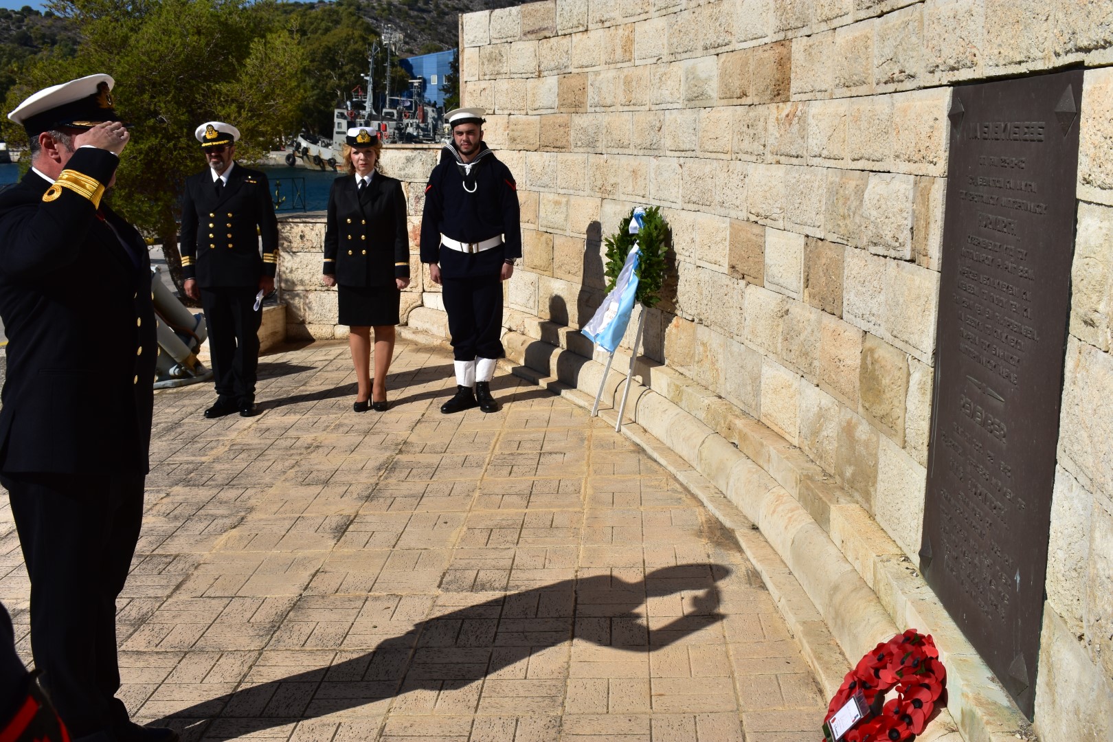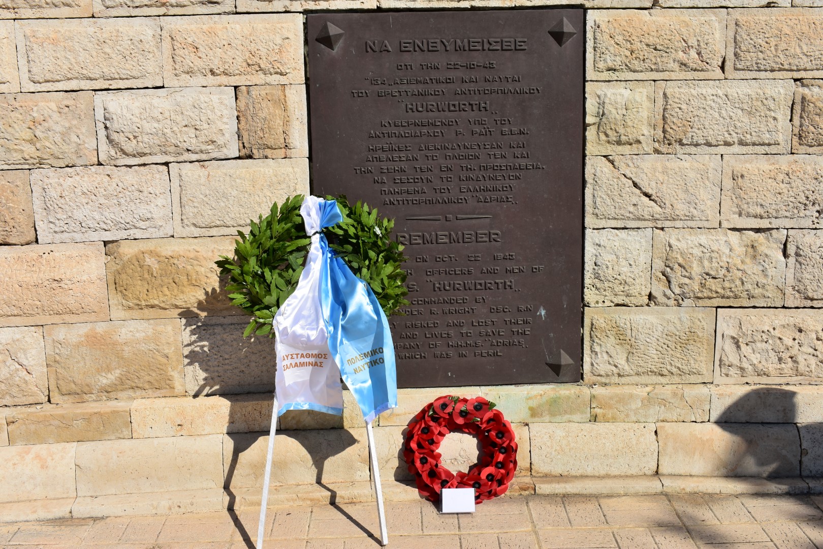 Ακολούθως και στο πλαίσιο της 79ης επετείου βύθισης του HMS HURWORTH από έκρηξη νάρκης, κατά τη διάρκεια του Β΄ Παγκοσμίου Πολέμου, εκτελέστηκε κατάθεση στεφάνου στο μνημείο πεσόντων, από τον Αρχιπλοίαρχο Tim Neild RN και από τον Διοικητή του Ναυστάθμου Σαλαμίνας, Αρχιπλοίαρχο Βασίλειο Βασιλογιαννακόπουλο ΠΝ.