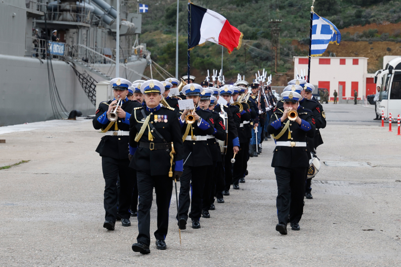 Λίγο πριν τις 11 η Γαλλίδα επίσημη και ο Έλληνας υπουργός έφτασαν στον ναύσταθμο Σαλαμίνας και επιθεώρησαν τα τιμητικά αγήματα