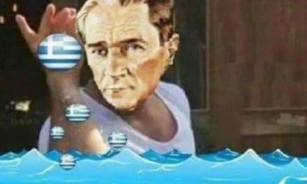 Σε μια από τις εικόνες που πόσταραν είναι το πρόσωπο Κεμάλ μονταρισμένο στο σώμα του Τούρκου μάγειρα που χειρίζεται... το αλάτι περίεργα. Μόνο που στην περίπτωση αυτή αντί για αλάτι πετάει στη θάλασσα ελληνικές σημαίες...
