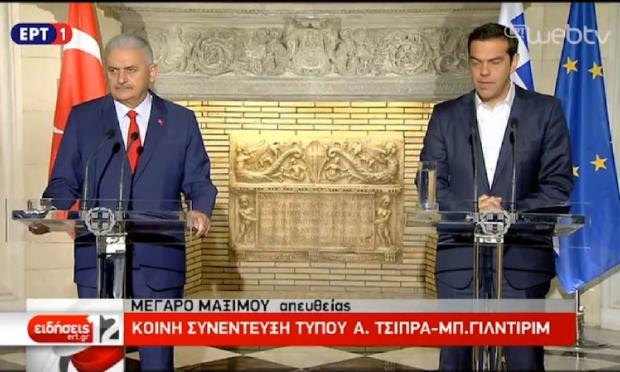 Ερώτηση για τους οκτώ Τούρκους αξιωματικούς που κατέφυγαν στην Ελλάδα, μετά το αποτυχημένο πραξικόπημα, δέχθηκαν ο Αλέξης Τσίπρας και ο Μπιναλί Γιλντιρίμ, κατά τη διάρκεια της συνέντευξης Τύπου που παραχώρησαν μετά το τέλος της συνάντησής τους στο Μέγαρο Μαξίμου.