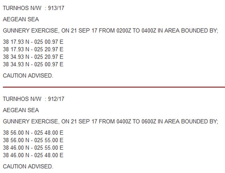 Σε ναυτικό επίπεδο η Άγκυρα με δύο NAVTEX για τις οποίες δεν έχει την δικαιοδοσία να εκδίδει δέσμευσε δύο περιοχές για αύριο για την διενέργεια ναυτικών ασκήσεων.