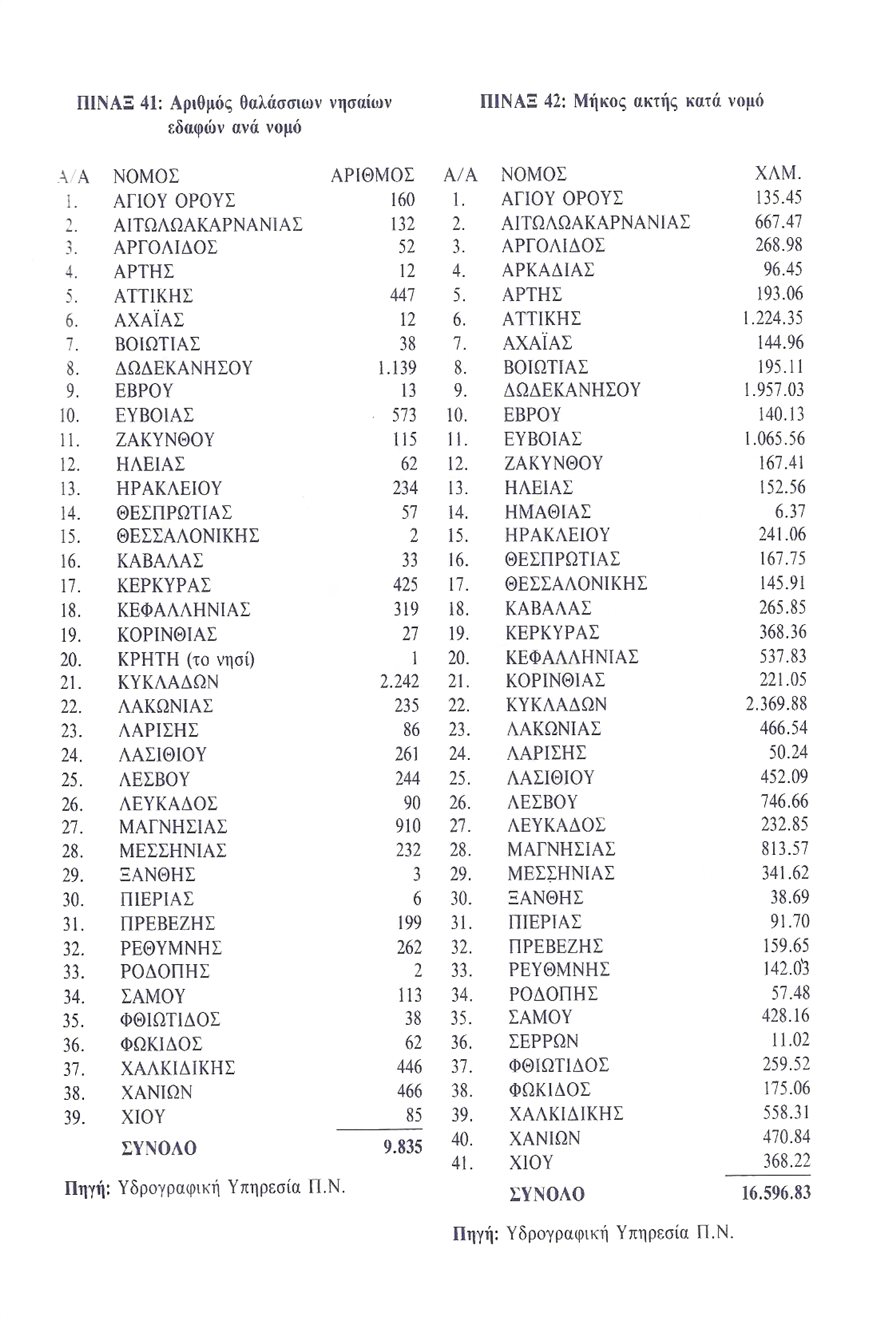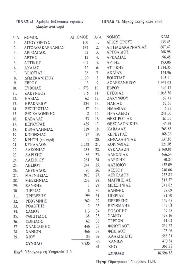 Από αυτόν, προκύπτει ότι, συνολικά, τα ελληνικά νησαία εδάφη (νησιά), είναι 9.835 (Πηγή: Υδρογραφική Υπηρεσία Π.Ν.). Τρεις παράκτιοι νομοί (Ημαθίας, Σερρών και Αρκαδίας), δεν διαθέτουν νησαία εδάφη.