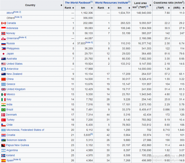 Αναζητώντας περισσότερα στοιχεία, βρήκαμε ότι και ένας παγκόσμιος, μη κερδοσκοπικός οργανισμός, το «World Resources Institute», που ιδρύθηκε το 1982 με χρηματοδότηση από το ίδρυμα MacArthur υπό την ηγεσία του James Gustave Speth, στη λίστα με τις ακτογραμμές όλων των χωρών του κόσμου, αναφέρει ότι η Ελλάδα έχει ακτογραμμή 15.147 χλμ. και η Τουρκία 8.140 χλμ. Παραθέτουμε τον σχετικό πίνακα (πηγή: WIKIPEDIA). Σ’ αυτόν, θα δείτε και τις ακτογραμμές πολλών άλλων χωρών του πλανήτη.