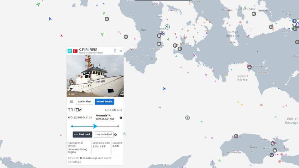 Σε διεθνή ύδατα ανάμεσα σε Χίο Ψαρά και Σάμο πλέει το πρωί της Δευτέρας το τουρκικό ερευνητικό σκάφος Πίρι Ρέις, σε συνέχεια της NAVTEX που έχει εκδώσει η Άκγυρα για έρευνες από τις 4-14 Οκτωβρίου.