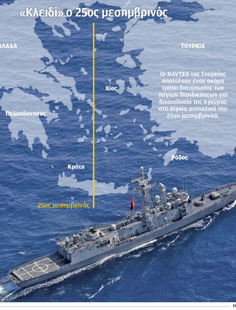 Σε μια κίνηση που σηματοδοτεί αλλαγή τακτικής και πιθανή κλιμάκωση της έντασης στο Αιγαίο προχωρά η Τουρκία, σύμφωνα με δημοσιεύματα του τουρκικού Τύπου. Όπως αποκαλύπτει η εφημερίδα Milliyet, η Άγκυρα επιχειρεί να επισημοποιήσει και να παγιώσει τις προειδοποιήσεις της προς την Ελλάδα μέσω της έκδοσης οδηγιών προς ναυτιλλομένους (NAVTEX) αόριστης διάρκειας (επ' αόριστον).