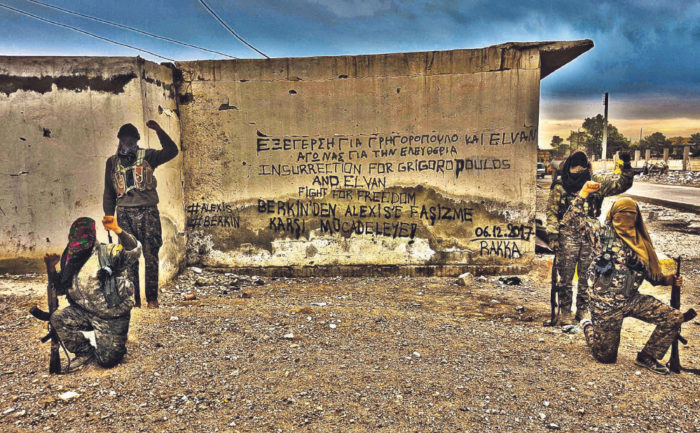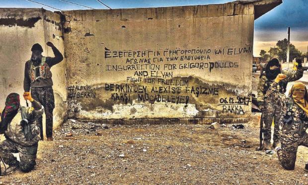 Την ίδια ώρα ανησυχία προκάλεσε στους αξιωματικούς της Ελληνικής Αστυνομίας η φωτογραφία που αναρτήθηκε σε ιστοσελίδα του αντιεξουσιαστικού χώρου με την αναγραφή συνθήματος για τον Αλέξανδρο Γρηγορόπουλο και τον Μπερκίν Ελβάν, σε τοίχο σπιτιού στη Ράκκα της Συρίας. «Εξέγερση για Γρηγορόπουλο και Elvan. Αγώνας για την Ελευθερία» γράφει το σύνθημα και δεξιά και αριστερά βρίσκονται δύο και δύο ένοπλοι κουκουλοφόροι, με τους αστυνομικούς να εξετάζουν την αυθεντικότητα της φωτογραφίας και αν είναι προϊόν φωτομοντάζ. Ο 15χρονος Μπερκίν Ελβάν συνδυάστηκε με τον Αλέξανδρο Γρηγορόπουλο όταν στις 11 Μαρτίου 2014, βγαίνοντας από το σπίτι του για να πάρει ψωμί, ένας αστυνομικός τού έριξε δακρυγόνο σε ευθεία βολή στοχεύοντας στο κεφάλι. Ο νεαρός είχε χάσει τη μάχη έπειτα από 9 μήνες σε κώμα.