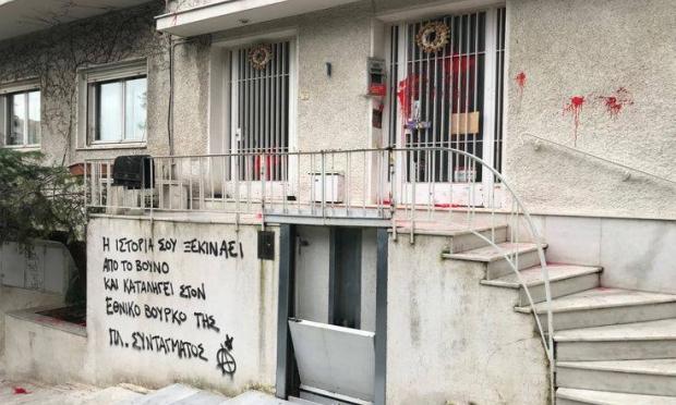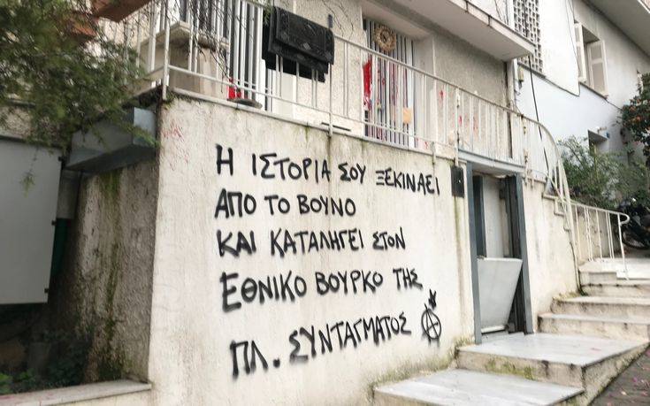 Σύμφωνα με πληροφορίες, ομάδα αναρχικών πέταξε μπογιές και έγραψε αισχρά μηνύματα στον τοίχο του σπιτιού του με κατακλείδα ότι η "η ιστορία του αρχίζει από το βουνό και καταλήγει στην πλατεία Συντάγματος.