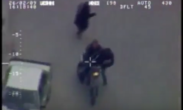 Το σπάνιο βίντεο αυτό καταγράφει την πορεία δύο ένοπλων ληστών, που όπως διαπιστώνεται, έχουν πραγματοποιήσει ληστεία στον Άλιμο. Η κάμερα του ελικοπτέρου καταγράφει την φρενήρη πορεία τους με ιλιγγιώδη ταχύτητα στη λεωφόρο Αλίμου, στη λεωφόρο Βουλιαγμένης, στην Ηλιούπολη, στα στενά της Αγίας Μαρίνας, όπου για πρώτη φορά υπάρχει κίνδυνος απώλειας τους μέσα στο πυκνό πολεοδομικό συγκρότημα.