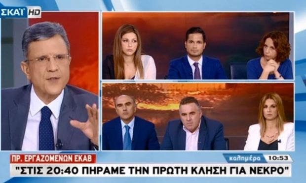 Στην πρωινή εκπομπή του ΣΚΑΪ, ο πρόεδρος των εργαζομένων του ΕΚΑΒ Γιώργος Μαθιόπουλος ανέφερε αναλυτικά τη σειρά των γεγονότων το μοιραίο απόγευμα της Δευτέρας στο Μάτι, όπως έχουν καταγραφεί στις κλήσεις που δέχθηκε το κέντρο τους. Μάλιστα τόνισε χαρακτηριστικά ότι "στις 20:40 είχαμε την πρώτη κλήση για νεκρό από τις πυρκαγιές στο Μάτι", κάτι που νωρίτερα είχαν αναφέρει τόσο ο επικεφαλής αξιωματικός των Ειδικών Δυνάμεων που ηγείτο της Μονάδας Υποβρυχίων Αποστολών που έσπευσαν στο σημείο, όσο και ο γενικός γραμματέας του Σωματείου Ειδικών Φρουρών, Στράτος Μαυροειδάκος.