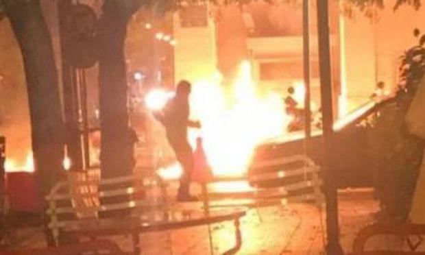 Οι κουκουλοφόροι πέταξαν μολότοφ αλλά και έναν εμπρηστικό μηχανισμό αποτελούμενο από γκαζάκι, ενώ κάποιοι φώναζαν προς τον σκοπό «θα σε κάψουμε μπάτσο».