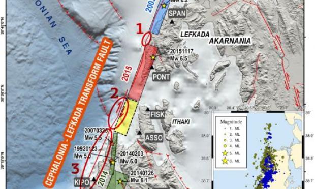Τα ρήγματα στα οποία αναμένεται να εκδηλωθούν οι επόμενοι μεγάλοι σεισμοί του Κεντρικού Ιονίου κατάφεραν να εντοπίσουν έλληνες επιστήμονες. Πρόκειται για τρία κομμάτια μεγάλων ρηγμάτων τα οποία δεν «έσπασαν» κατά τη διάρκεια πρόσφατων ισχυρών σεισμών: Το πρώτο, μήκους 6 χιλιομέτρων, εντοπίζεται κατά μήκος της δυτικής ακτής της Λευκάδας, το δεύτερο, μήκους 14 χιλιομέτρων, βρίσκεται βορειοδυτικά της Κεφαλονιάς και το τρίτο με μήκος 30 χιλιόμετρα κατεγράφη στις δυτικές ακτές του νησιού.