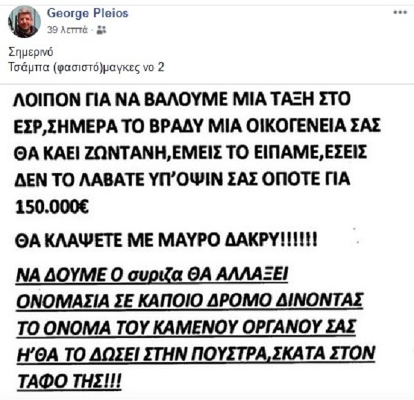 Όσον αφορά στην κοινοποίηση της απειλητικής επιστολής στο Facebook ο κ. Πλειός τόνισε ότι «είναι δική μου προσωπική απόφαση διότι με αφορά. Είναι μια απειλή και προς το πρόσωπό μου κι έχω το δικαίωμα να την διαχειριστώ όπως νομίζω. Πρέπει να ξέρει η κοινή γνώμη στην Ελλάδα και πολλοί άλλοι παράγοντες τι συμβαίνει. Νομίζω ότι έχουμε χρέος».